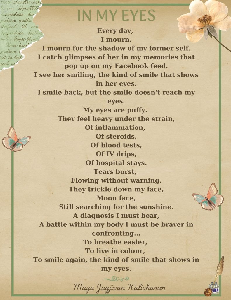 I’m deeply grateful for such genuine support and my tribe who rally around me. They’ve helped me become a little braver, and so I’m sharing this poem, which I began writing in hospital last year. It made me very emotional. I kept it in my drafts, unfinished, and I completed it when I was admitted to hospital two months ago.